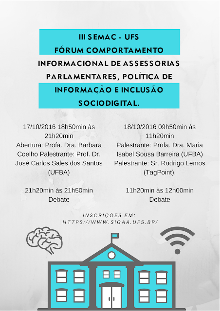 Na próxima semana, dia 17, tem início na Universidade Federal de Sergipe (UFS) a III SEMAC (Semana Acadêmica), onde se realizará o "Fórum Comportamento Informacional de Assessorias Parlamentares, Política de Informação e Inclusão Sociodigital".